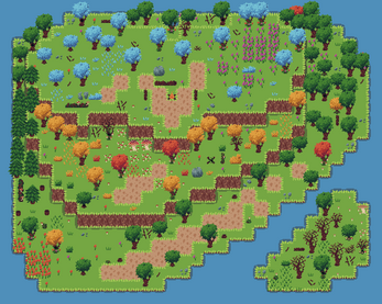 Tileset: flat and elevated grass tiles, elevated walls, path tile, water, shadow.