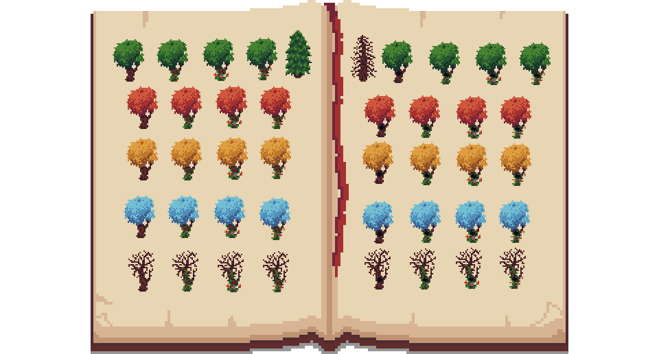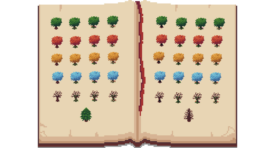 Small trees: different leaves color, different trunks, pine trees, and dead trees.