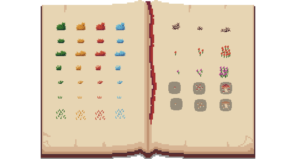 Greenery: bushes, grass, flowers, mushrooms.